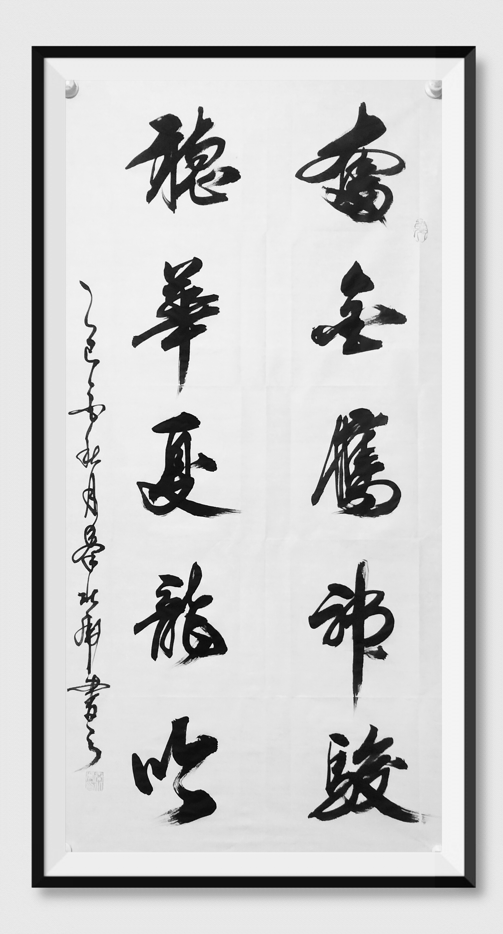 他的榜书,浑厚雄强,力透纸背,观者常感气势逼人,仿佛能听见纸面震颤之声;而其草书,则如游龙万里,风云雷电,一气呵成。他独创的“风云大草”,将情感、节奏与哲思熔于一炉,被誉为“纸上太极,墨中舞蹈”。