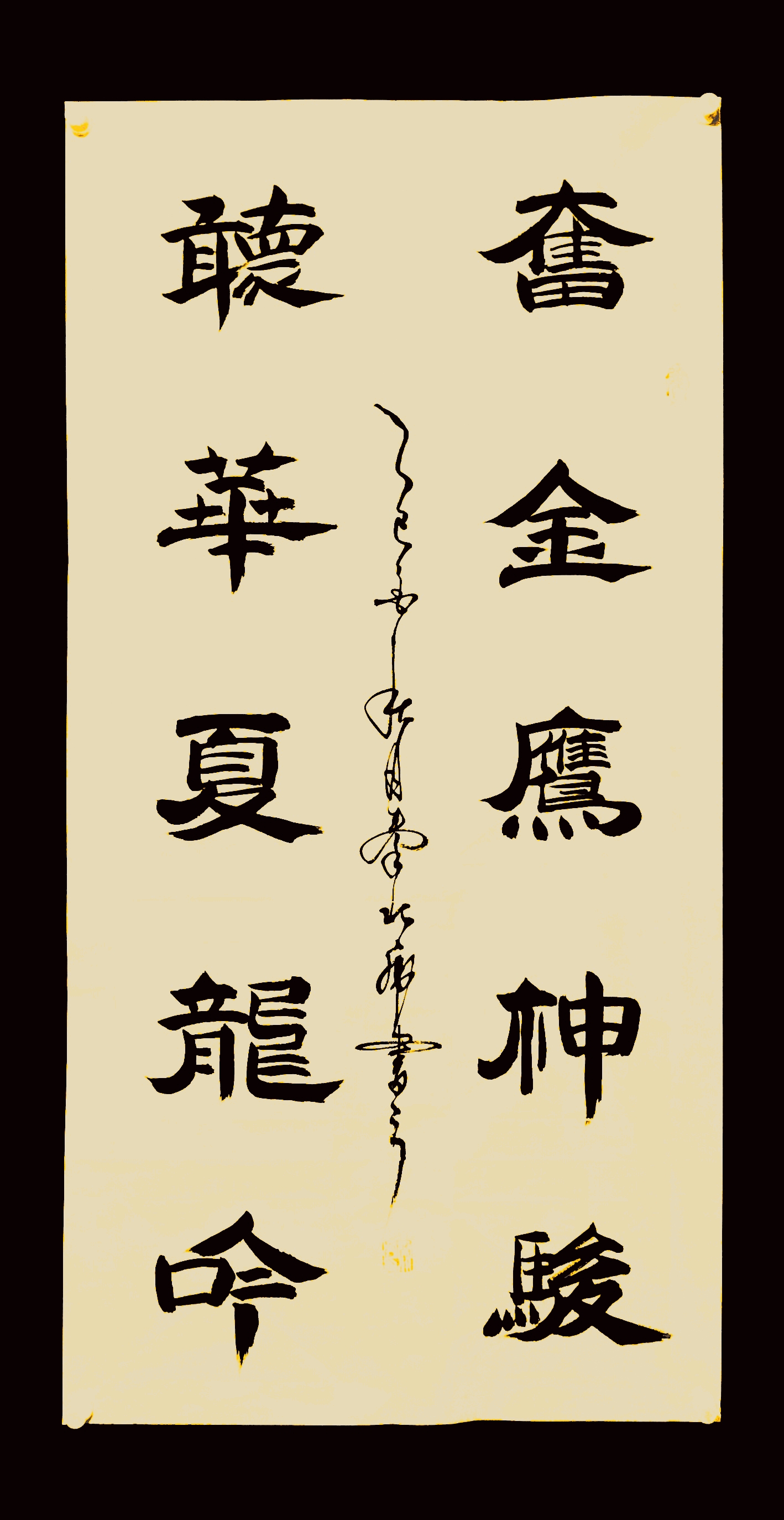 其艺术最令人惊叹之处,在于“正反双笔”——左右开弓,一手正书,一手反书,阴阳相济,气韵贯通。这不仅是技艺的突破,更是道家“负阴抱阳,冲气以为和”思想的笔墨呈现。他将太极拳的“掤、捋、挤、按”八法融入笔锋起落之间,落笔如雷,行笔如风,收笔如岳,每一划都凝聚着身心合一的力量。